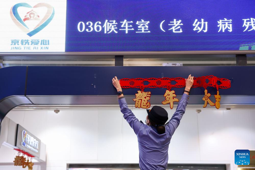 A staff member puts up Spring Festival decorations at a waiting hall of Beijing West Railway Station in Beijing, capital of China, on Jan. 26, 2024. (Xinhua/Ju Huanzong)