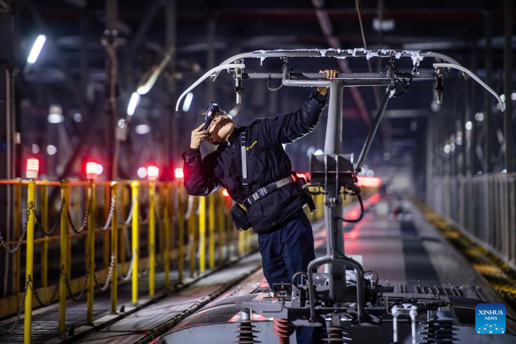A staff member works at a bullet train maintenance base in Changsha, central China's Hunan Province, Jan. 26, 2024. (Xinhua/Chen Sihan)
