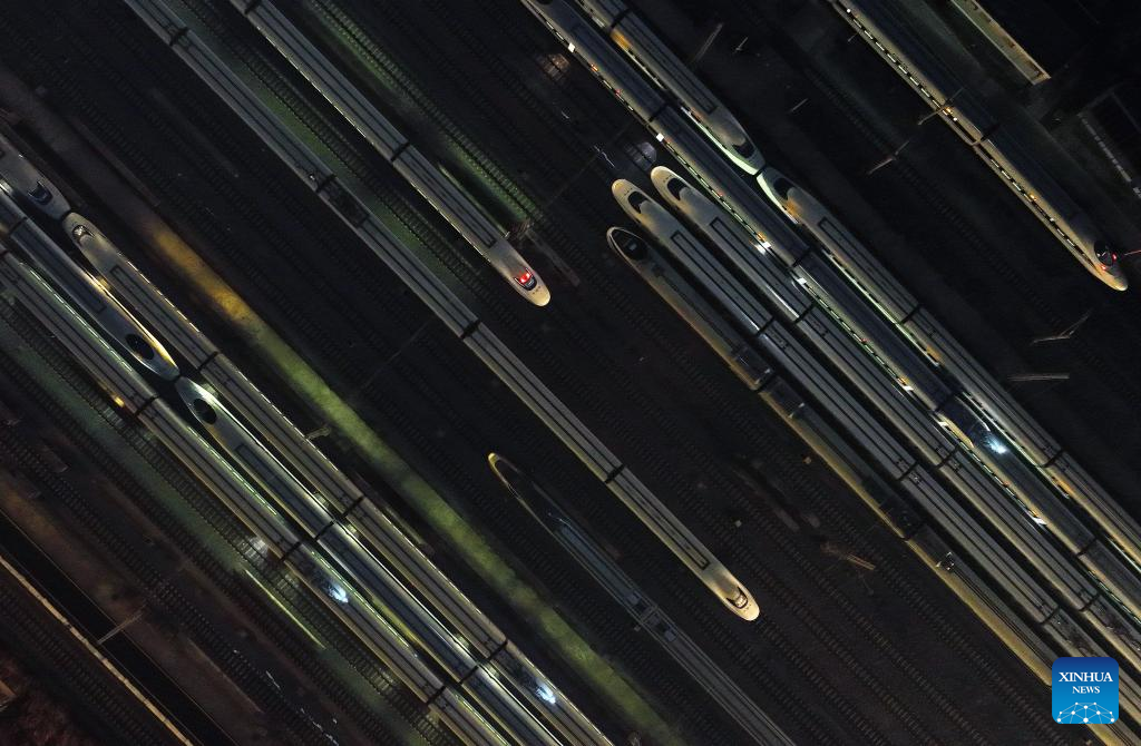 An aerial drone photo taken on Jan. 26, 2024 shows bullet trains at a maintenance base in Guangzhou, south China's Guangdong Province. (Xinhua/Deng Hua)