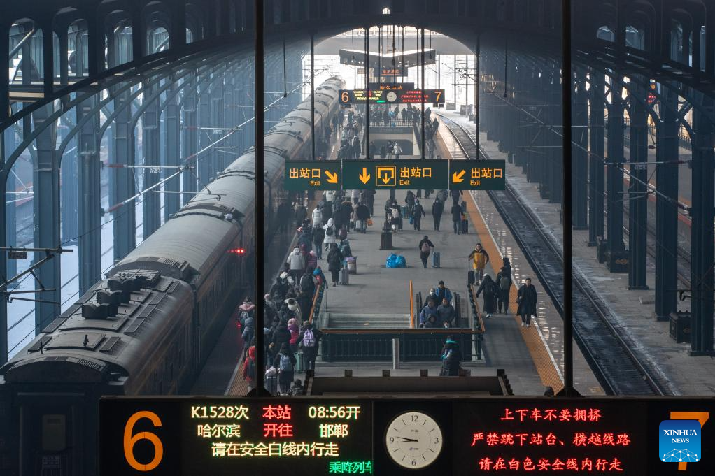 Passengers are seen on a platform at Harbin Railway Station in Harbin, northeast China's Heilongjiang Province, Jan. 26, 2024. (Xinhua/Zhang Tao)