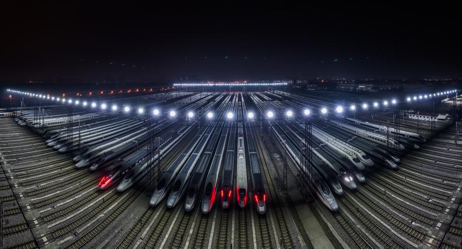 A stitched panoramic aerial photo shows bullet trains at a maintenance base in Wuhan, central China's Hubei Province, Jan. 26, 2024. (Xinhua/Wu Zhizun)