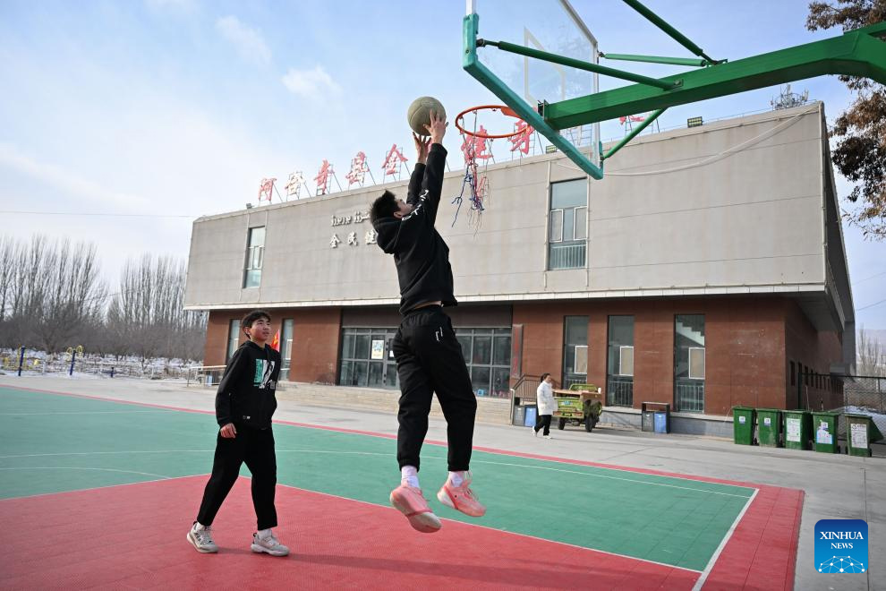 Residents play basketball outdoor in Akqi County, northwest China's Xinjiang Uygur Autonomous Region, Jan. 26, 2024. Most shops, supermarkets and other commercial facilities have resumed operation, and local people's life are returning to normal in an orderly manner in Akqi County. A 7.1-magnitude earthquake jolted Wushi County in Aksu Prefecture in northwest China's Xinjiang Uygur Autonomous Region on Jan. 23. Akqi, which is adjacent to Wushi, also suffered heavily from the quake. (Xinhua/Li Xiang)