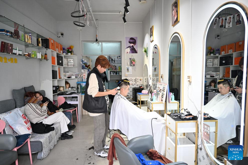 A customer has his hair cut at a barbershop in Akqi County, northwest China's Xinjiang Uygur Autonomous Region, Jan. 26, 2024. Most shops, supermarkets and other commercial facilities have resumed operation, and local people's life are returning to normal in an orderly manner in Akqi County. A 7.1-magnitude earthquake jolted Wushi County in Aksu Prefecture in northwest China's Xinjiang Uygur Autonomous Region on Jan. 23. Akqi, which is adjacent to Wushi, also suffered heavily from the quake. (Xinhua/Li Xiang)