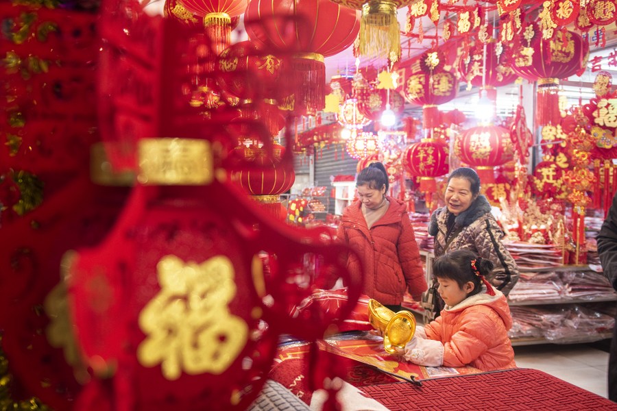 Citizens choose New Year decorations at a wholesale market in Loudi of central China's Hunan Province, Jan. 14, 2024. (Photo by Wu Yonghua/Xinhua)