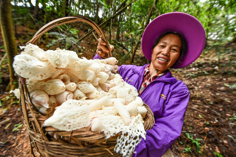 A villager shows freshly harvested bamboo fungus at a planting base in Gaonan Village of Rongjiang County, southwest China's Guizhou Province, Sept. 18, 2020. (Xinhua/Yang Wenbin)