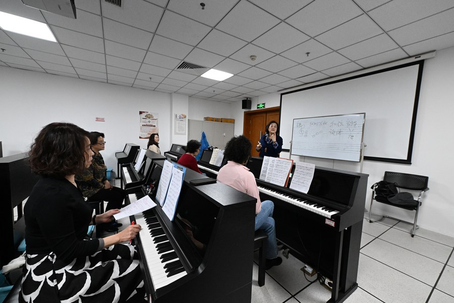 Senior citizens take a piano lesson at the culture center of Hexi District, north China's Tianjin, April 4, 2023. (Xinhua/Sun Fanyue)
