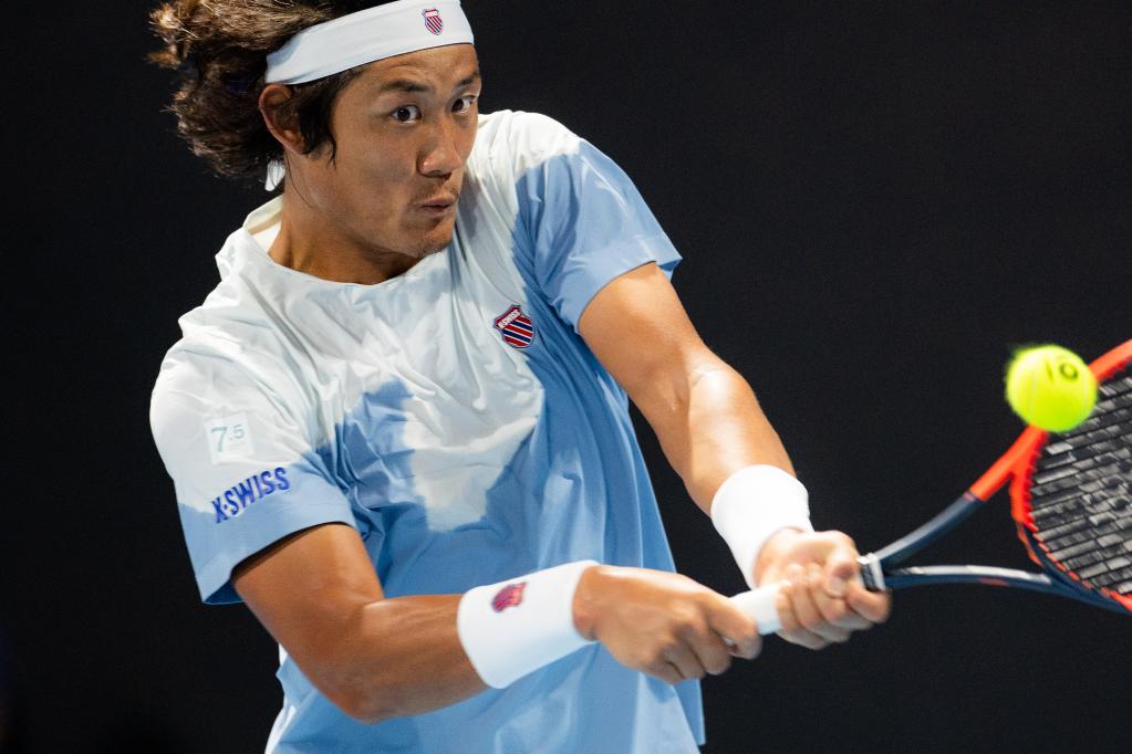 Shang Juncheng hits a return during his men's singles second round victory against Sumit Nagal at the Australian Open, Jan. 18, 2024. (Photo by Chu Chen/Xinhua)