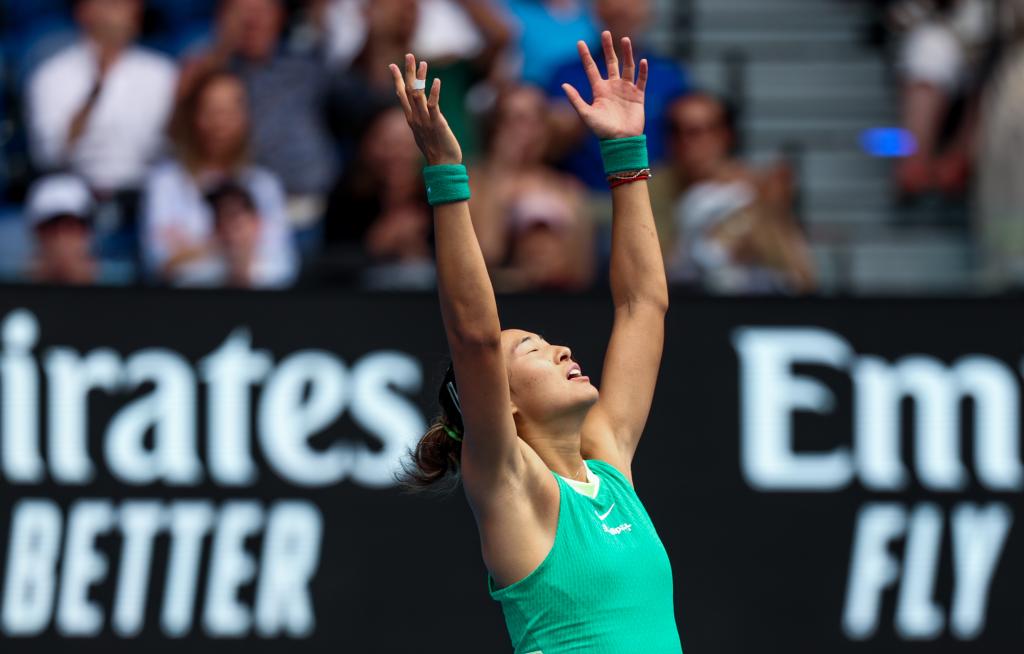 Zheng celebrates after winning over compatriot Wang Yafan in the women's singles third round of the Australian Open, Jan. 20, 2024. (Xinhua/Hu Jingchen)