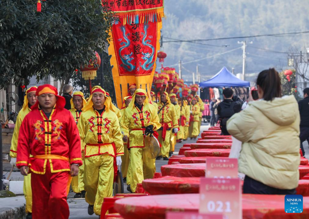 People perform during a Chinese New Year culture festival in Lianhua Town of Jiande City, east China's Zhejiang Province, Jan. 28, 2024. A culture festival celebrating the upcoming Chinese New Year is held in Lianhua Town on Sunday. Tourists enjoyed watching traditional performances while having delicacies at a large open-air banquet consisted of 100 tables amid a bustling and festive atmosphere. (Xinhua/Xu Yu)