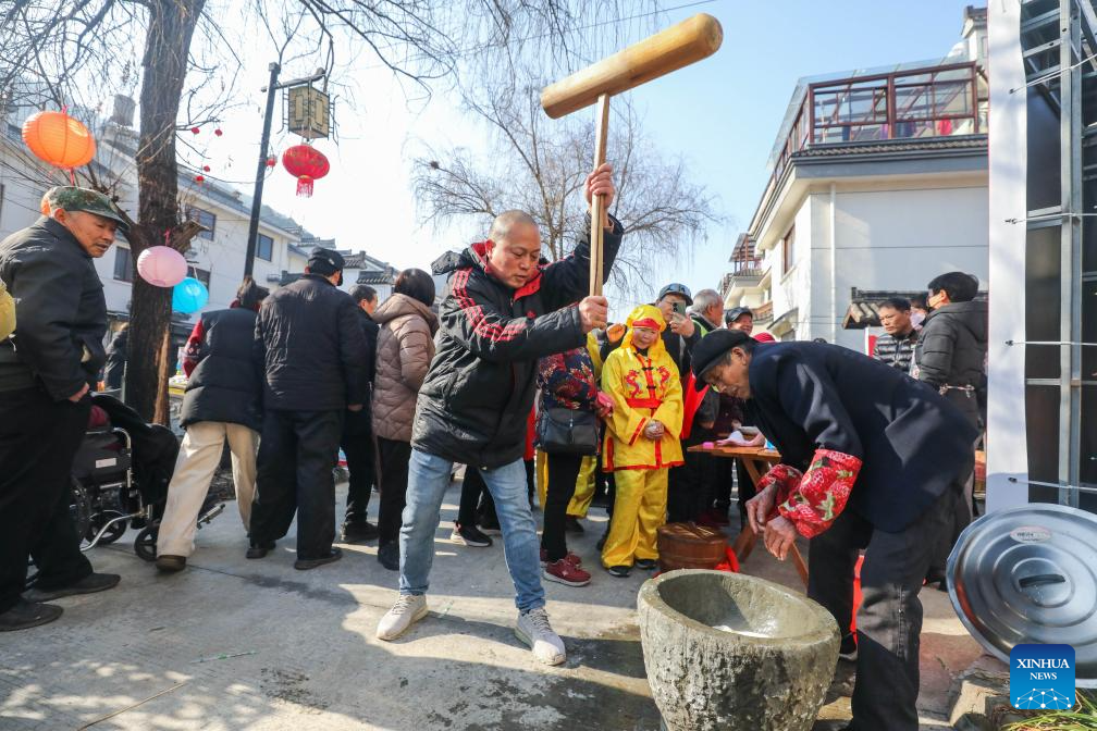 A man makes maci, a local snack made from sticky rice, during a Chinese New Year culture festival in Lianhua Town of Jiande City, east China's Zhejiang Province, Jan. 28, 2024. A culture festival celebrating the upcoming Chinese New Year is held in Lianhua Town on Sunday. Tourists enjoyed watching traditional performances while having delicacies at a large open-air banquet consisted of 100 tables amid a bustling and festive atmosphere. (Xinhua/Xu Yu)