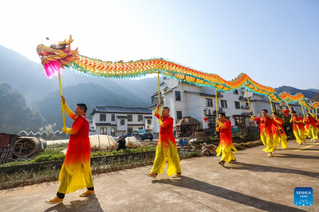 People perform dragon dance during a Chinese New Year culture festival in Lianhua Town of Jiande City, east China's Zhejiang Province, Jan. 28, 2024. A culture festival celebrating the upcoming Chinese New Year is held in Lianhua Town on Sunday. Tourists enjoyed watching traditional performances while having delicacies at a large open-air banquet consisted of 100 tables amid a bustling and festive atmosphere. (Xinhua/Xu Yu)