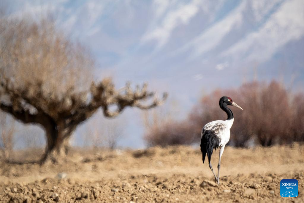 This photo taken on Jan. 27, 2024 shows a black-necked crane in Namling County of Xigaze City, southwest China's Xizang Autonomous Region. The black-necked crane, a species under first-class state protection in China, mainly inhabits plateau meadows and marshes at an altitude of 2,500 to 5,000 meters. (Photo by Dainzin Nubo/Xinhua)