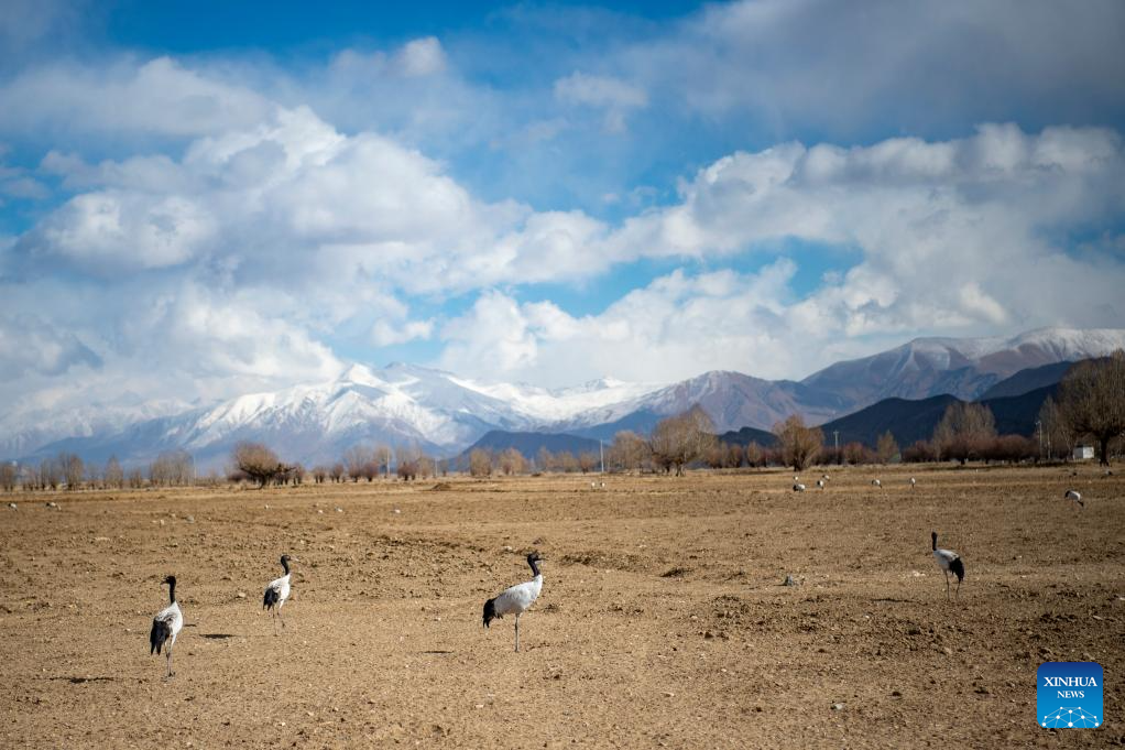 This photo taken on Jan. 27, 2024 shows black-necked cranes in Namling County of Xigaze City, southwest China's Xizang Autonomous Region. The black-necked crane, a species under first-class state protection in China, mainly inhabits plateau meadows and marshes at an altitude of 2,500 to 5,000 meters. (Photo by Dainzin Nubo/Xinhua)