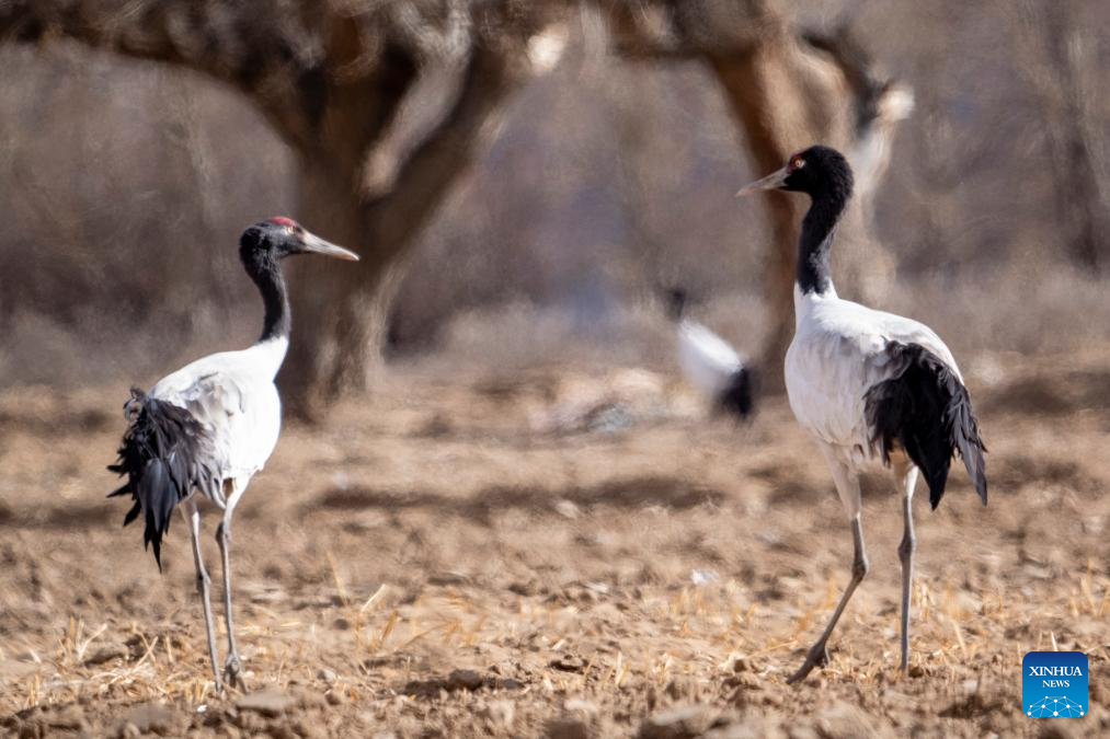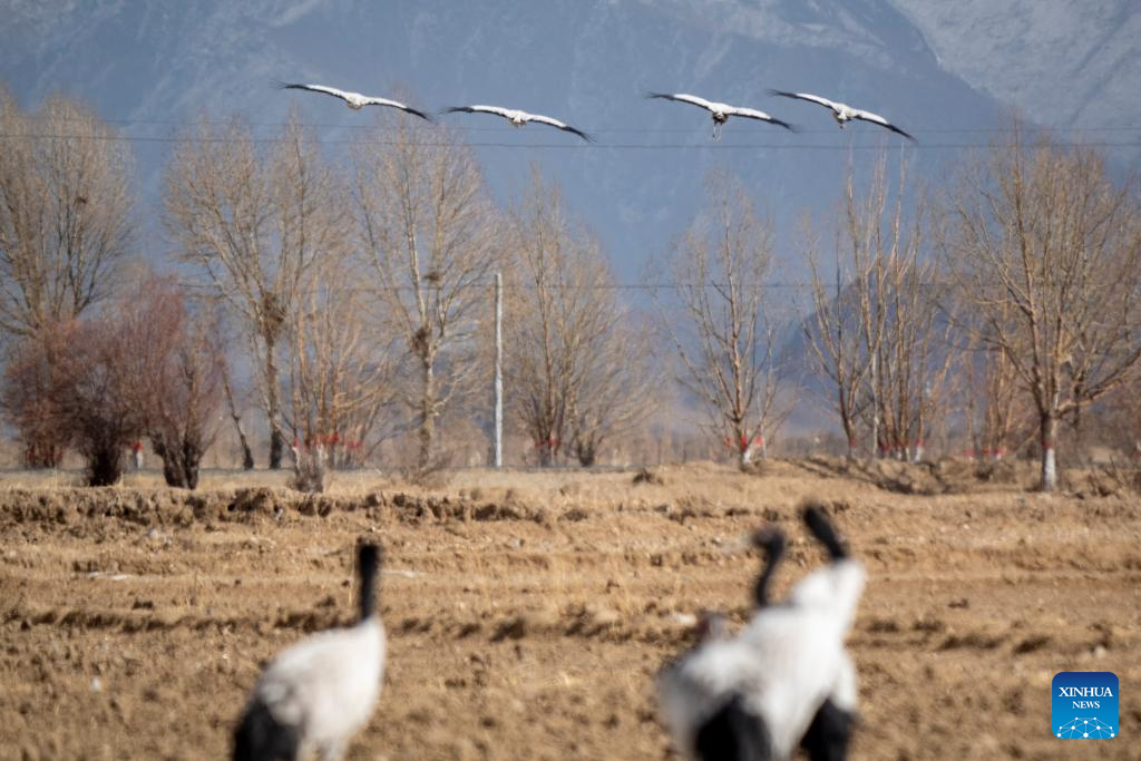 This photo taken on Jan. 27, 2024 shows black-necked cranes in Namling County of Xigaze City, southwest China's Xizang Autonomous Region. The black-necked crane, a species under first-class state protection in China, mainly inhabits plateau meadows and marshes at an altitude of 2,500 to 5,000 meters. (Xinhua/Liu Wenbo)