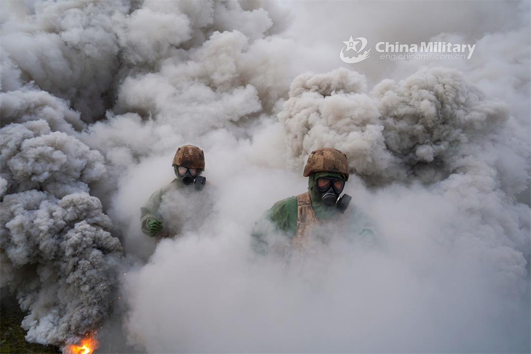 Two soldiers wearing gas masks assigned to a brigade under the PLA 77th Group Army pass through simulated toxic environment during a force-on-force training drill on January 12, 2024. (eng.chinamil.com.cn/Photo by Qiu Chengyi)