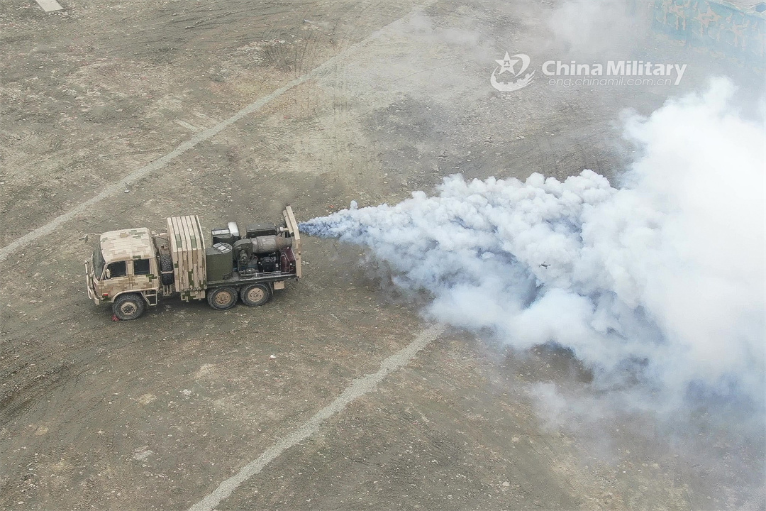A military truck mounted with smoke-generation device attached to a brigade under the PLA 77th Group Army releases smoke during a force-on-force training drill on January 12, 2024. (eng.chinamil.com.cn/Photo by Qiu Chengyi)