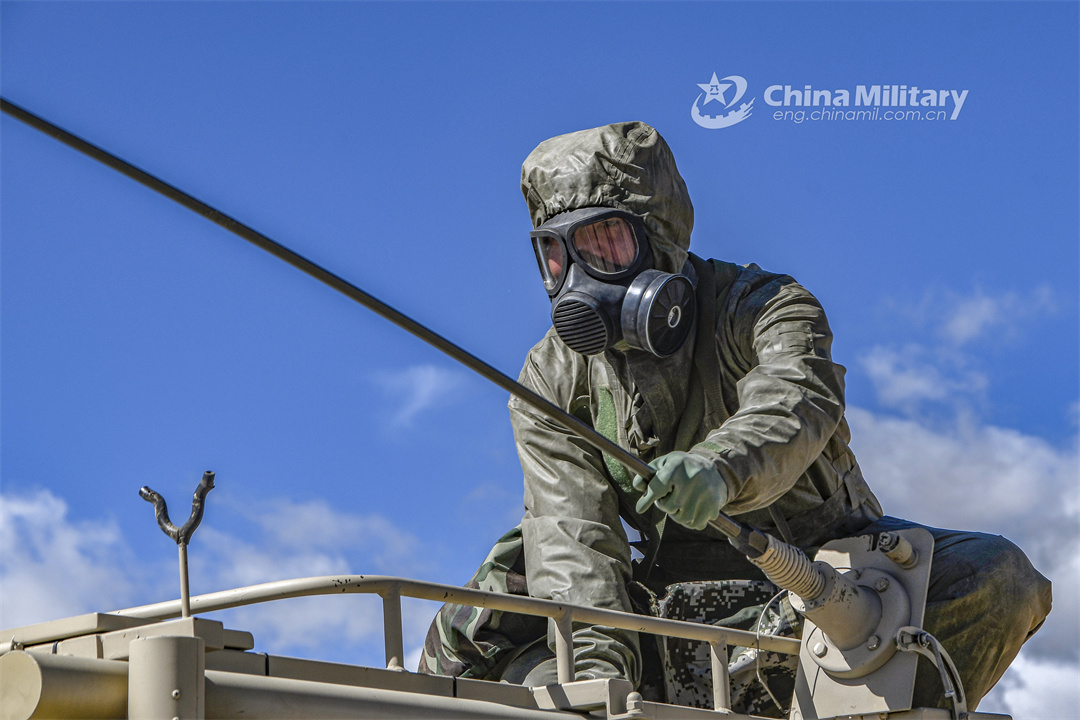 A soldier in chemical protection suit assigned to a brigade under the PLA 77th Group Army erects up antenna during a force-on-force training drill on January 12, 2024. (eng.chinamil.com.cn/Photo by Qiu Chengyi)