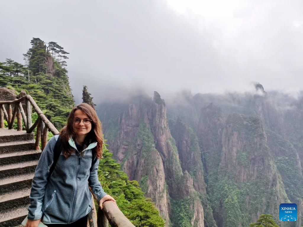 Deborah Bret visits Huangshan Mountain scenic area in Huangshan City, east China's Anhui Province, May 27, 2023. Deborah Bret, a 21-year-old student from Lyon, France, majors in clinical medicine at Anhui Medical University. (Xinhua)