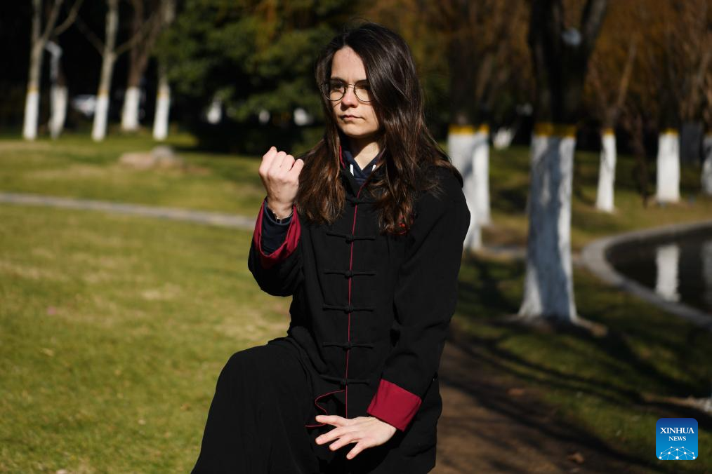 Deborah Bret practices Taichi by a lake in Hefei City, east China's Anhui Province, Jan. 23, 2024. Deborah Bret, a 21-year-old student from Lyon, France, majors in clinical medicine at Anhui Medical University. (Xinhua/Zhang Duan)