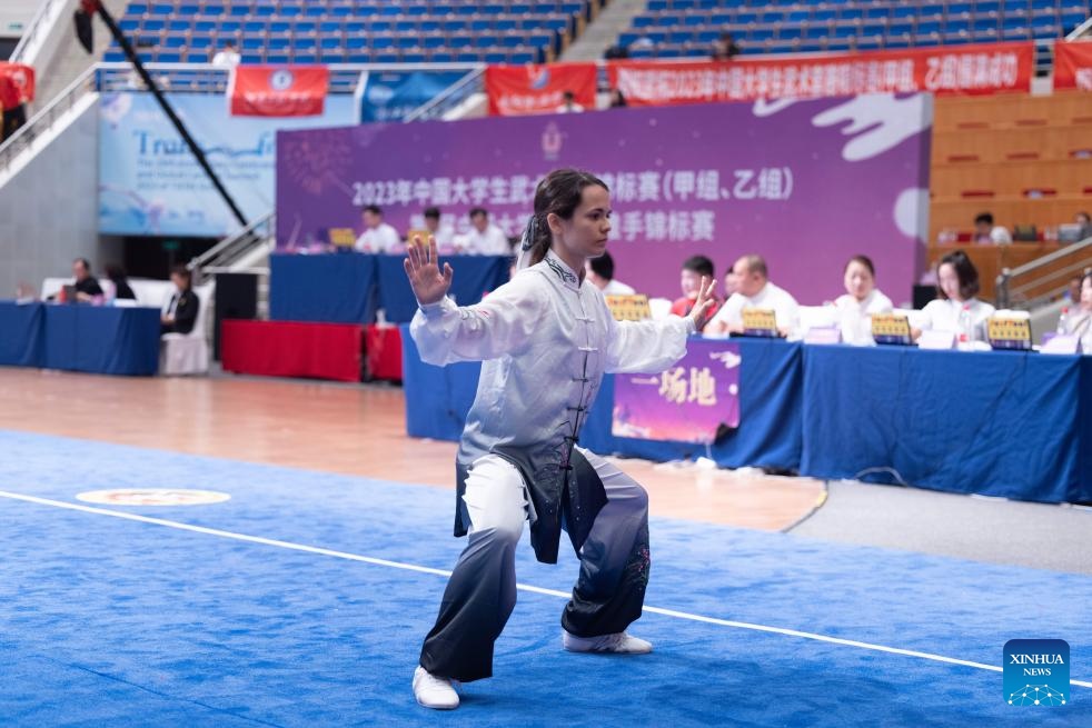 Deborah Bret competes during a national Wushu competition for college students in north China's Tianjin, Oct. 8, 2023. Deborah Bret, a 21-year-old student from Lyon, France, majors in clinical medicine at Anhui Medical University. (Xinhua)