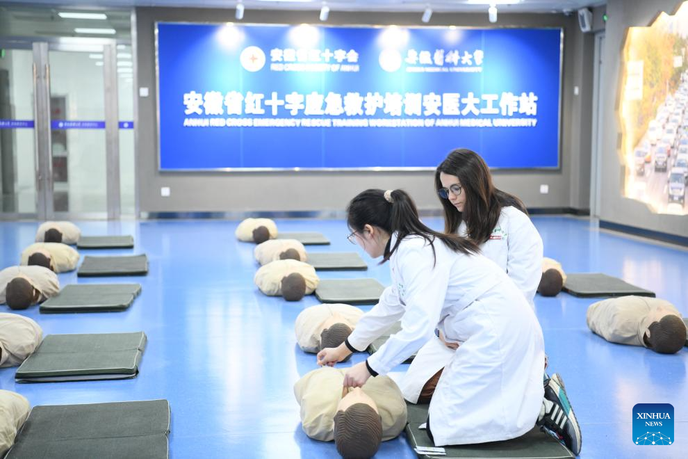 Deborah Bret (back) learns cardiopulmonary resuscitation (CPR) technique at Anhui Medical University, Hefei City, east China's Anhui Province, Jan. 23, 2024. Deborah Bret, a 21-year-old student from Lyon, France, majors in clinical medicine at Anhui Medical University. (Xinhua/Zhang Duan)