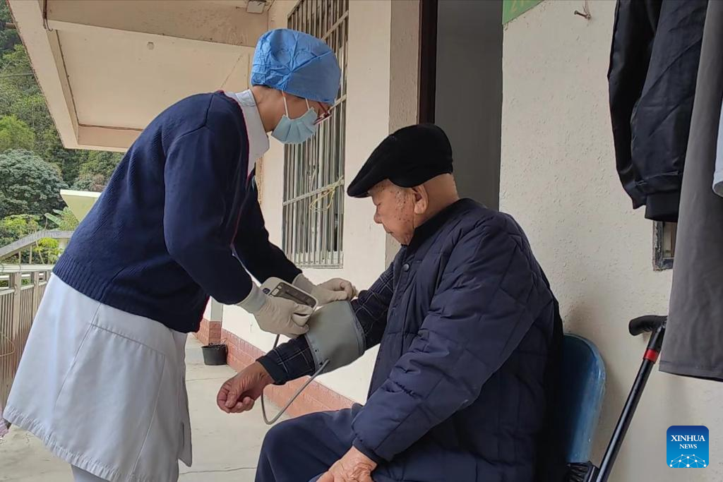 A nurse measures blood pressure for a leprosy convalescent at the rehabilitation center in Guangzhou, south China's Guangdong Province, Jan. 25, 2024. (Xinhua/Xu Hongyi)