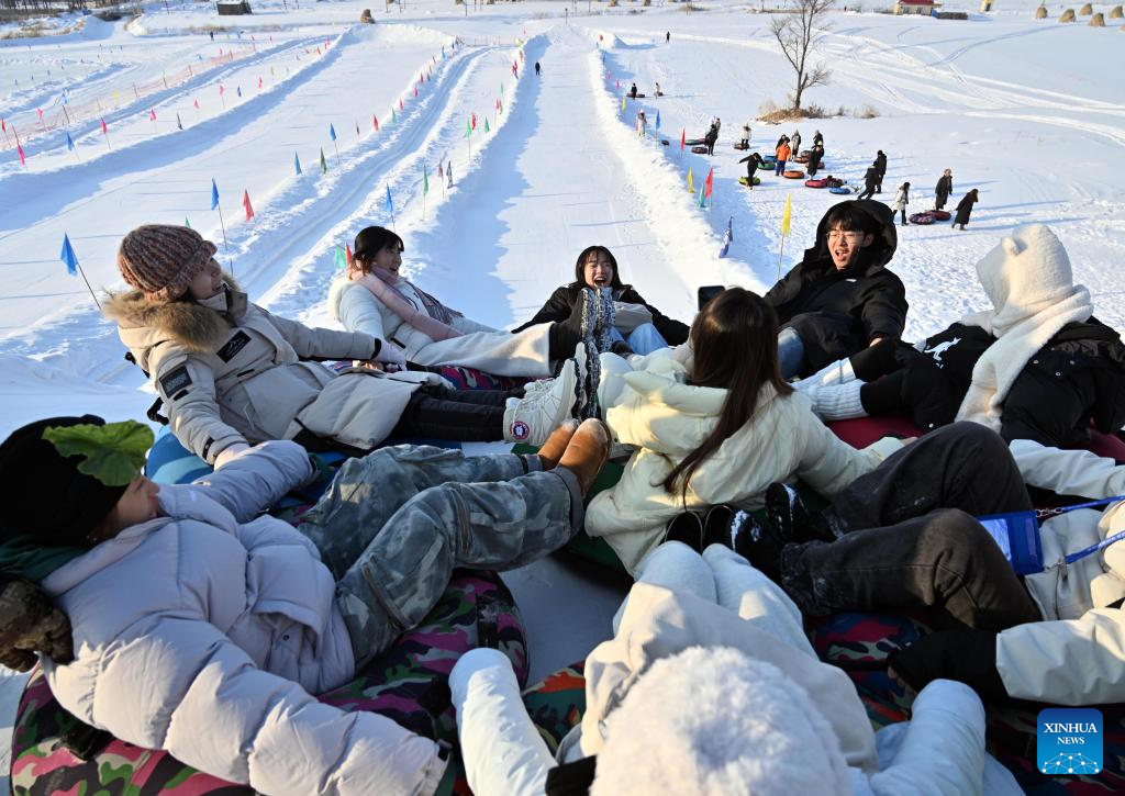 Students from southeast China's Taiwan play on snow slopes in Shulan, northeast China's Jilin Province, on Jan. 26, 2024. Boasting abundant ice and snow resources, Jilin Province in northeast China continues to optimize its tourism service to gain prominence as one of the most popular winter destinations for tourists. (Xinhua/Chen Yehua)