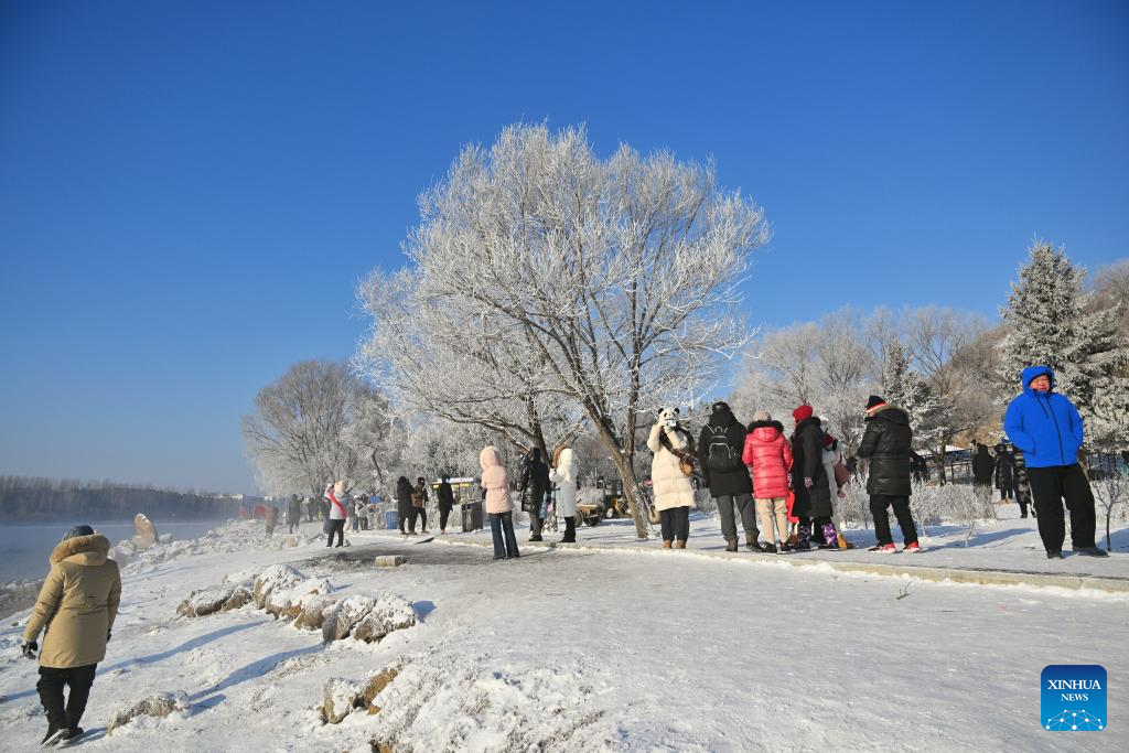 Tourists enjoy the rime scenery along a river in Jilin City, northeast China's Jilin Province, on Jan. 26, 2024. Boasting abundant ice and snow resources, Jilin Province in northeast China continues to optimize its tourism service to gain prominence as one of the most popular winter destinations for tourists. (Xinhua/Chen Yehua)