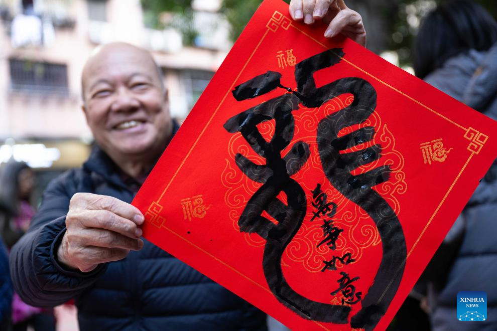 A person holds a piece of red paper written with the Chinese character "Dragon" during a cultural event in Macao, south China, Jan. 28, 2024. More than 30 calligraphers participated in a cultural event in Macao on Sunday to celebrate the upcoming Chinese Spring Festival. (Xinhua/Cheong Kam Ka)