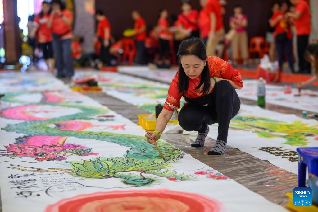 Students create a long scroll in Kelang, Selangor state, Malaysia, Jan. 28, 2024. Around 200 students in Kelang participate in the creation of dragon-themed long scrolls to celebrate the upcoming Chinese Lunar New Year of the Dragon. (Photo by Chong Voon Chung/Xinhua)