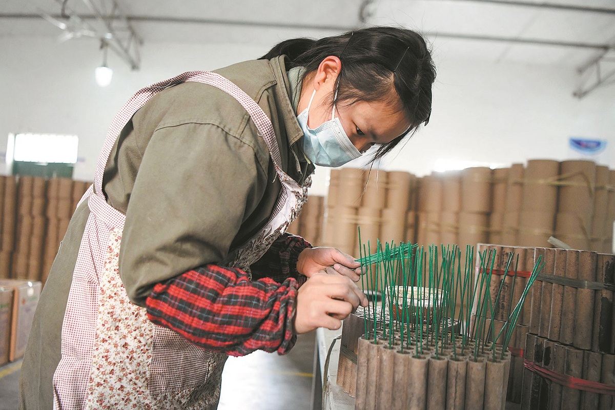 A worker makes fireworks in Liuyang, Hunan province. YANG HUAFENG/CHINA NEWS SERVICE