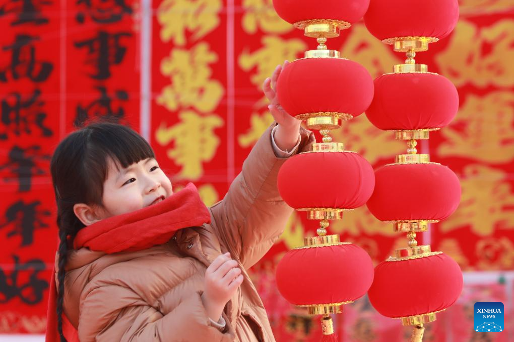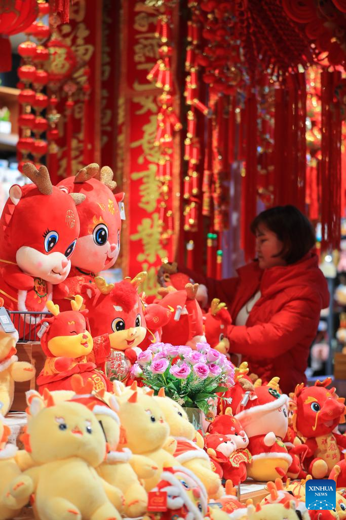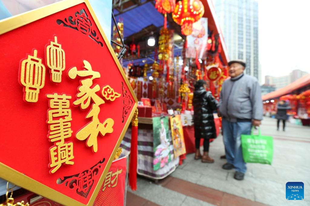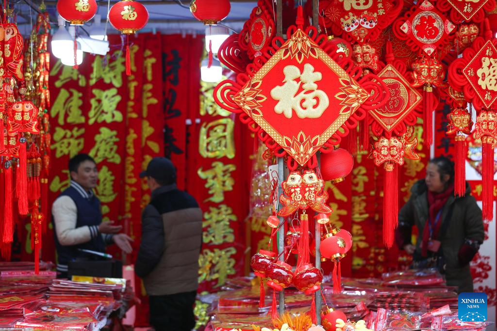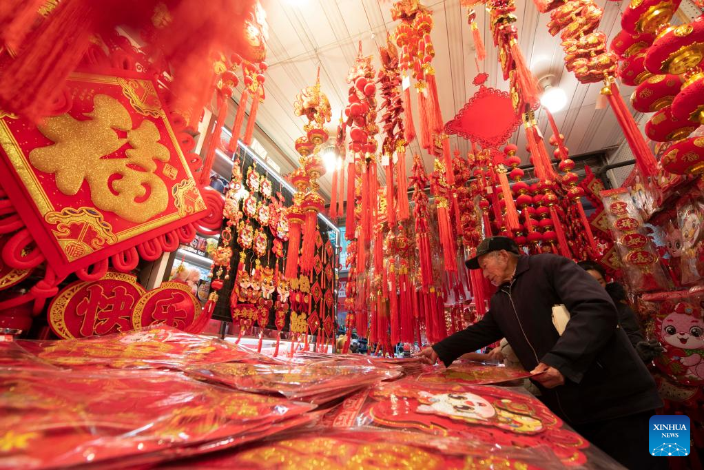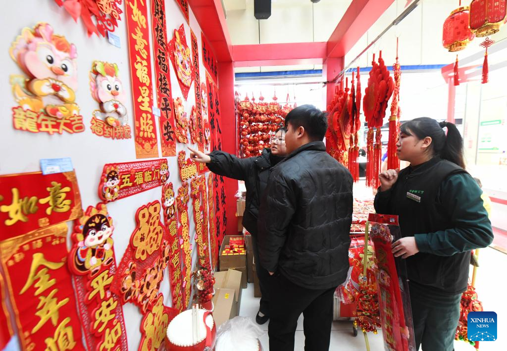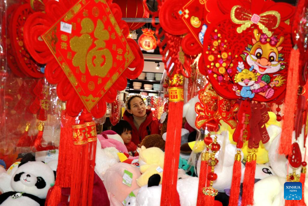 People buy Chinese Lunar New Year decorations in Shijiazhuang, north China's Hebei Province, Jan. 29, 2024. The Chinese Lunar New Year, or Spring Festival, falls on Feb. 10 this year. (Photo by Jia Minjie/Xinhua)