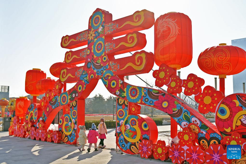 Children watch festive lanterns at a plaza in Yantai, east China's Shandong Province, Jan. 28, 2024. Festive decorations are seen across the country as the Spring Festival approaches. (Photo by Sun Wentan/Xinhua)