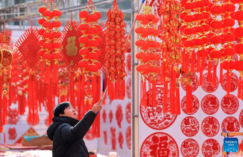 A seller prepares Chinese Lunar New Year decorations at a market in Shijiazhuang, north China's Hebei Province, Jan. 29, 2024. The Chinese Lunar New Year, or Spring Festival, falls on Feb. 10 this year. (Photo by Liang Zidong/Xinhua)