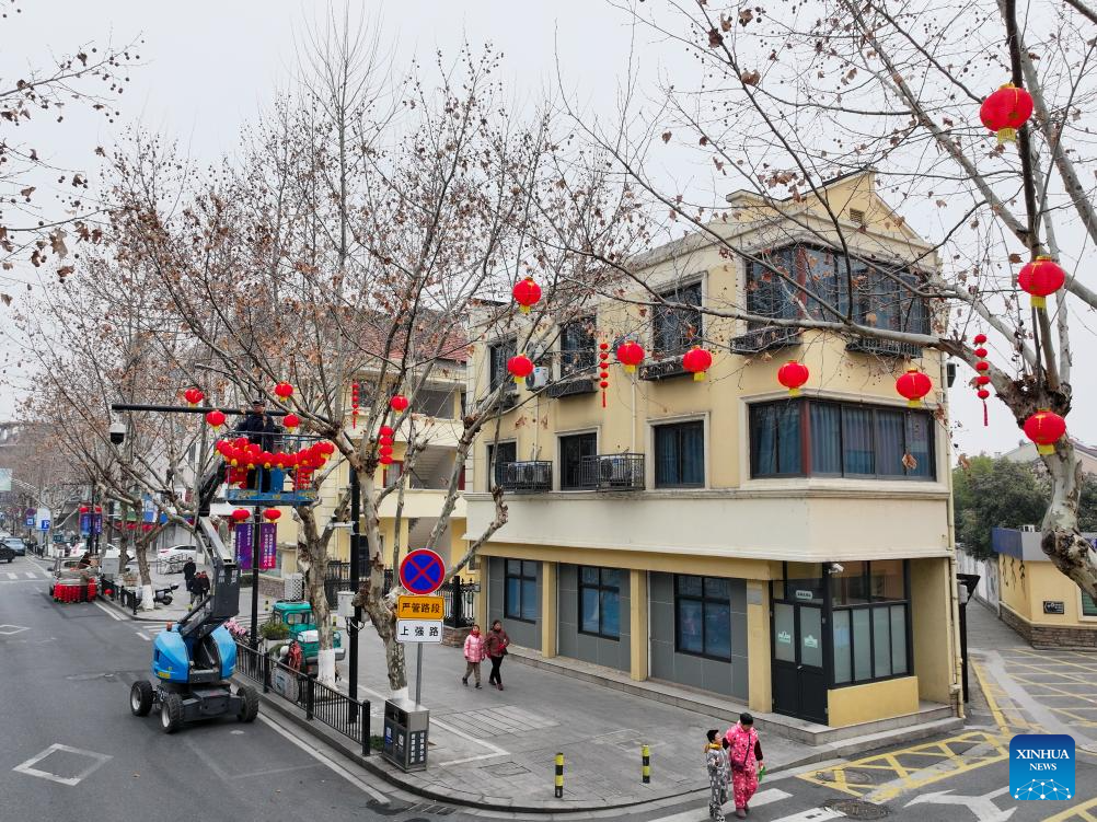 A drone photo taken on Jan. 29, 2024 shows workers decorating a street with festive lanterns for the upcoming Chinese Lunar New Year in Huzhou City, east China's Zhejiang Province. Festive decorations are seen across the country as the Spring Festival approaches. (Photo by He Weiwei/Xinhua)