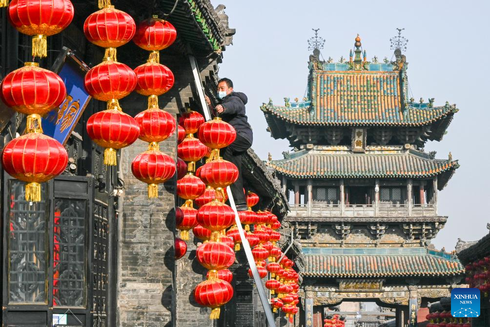 A man hangs red lanterns to greet the Chinese Lunar New Year in the ancient town of Pingyao in north China's Shanxi Province, Jan. 29, 2024. Festive decorations are seen across the country as the Spring Festival approaches. (Photo by Liang Shengren/Xinhua)