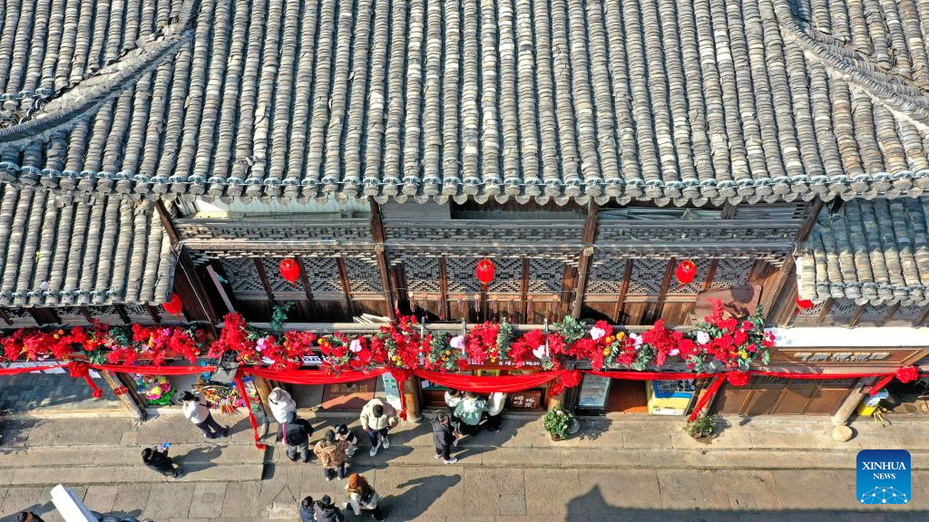 An aerial drone photo taken on Jan. 28, 2024 shows decorations in preparation for the upcoming Chinese Lunar New Year in Linhai City, east China's Zhejiang Province. Festive decorations are seen across the country as the Spring Festival approaches. (Photo by Wang Huabin/Xinhua)