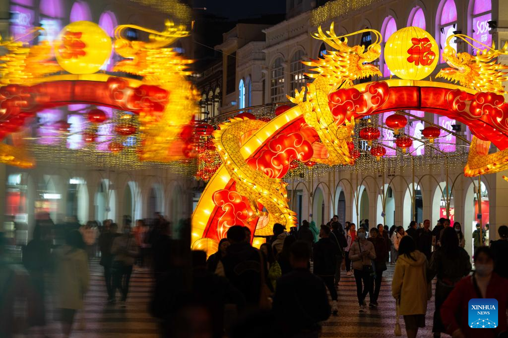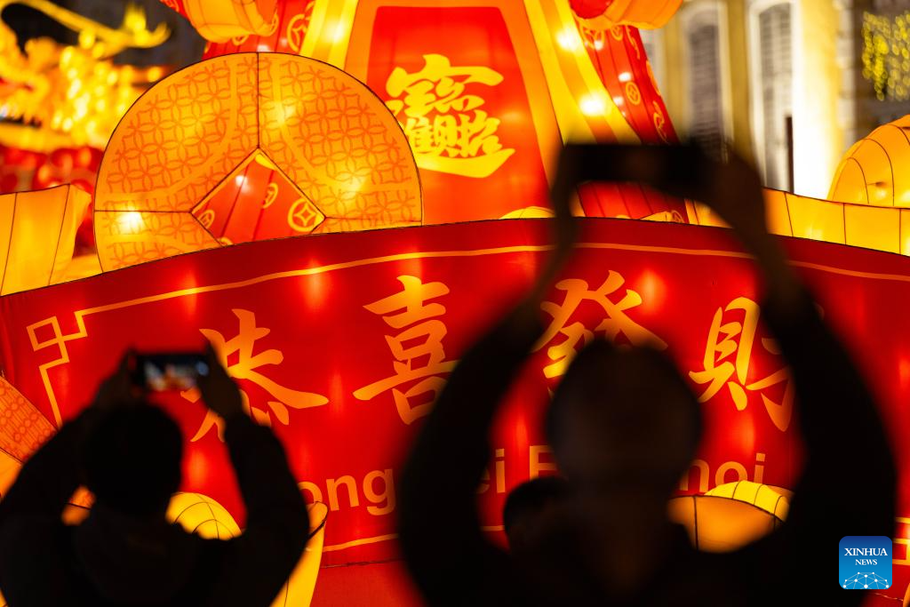 People take pictures of light decorations ahead of the Chinese Lunar New Year in south China's Macao, Jan. 29, 2024. (Xinhua/Cheong Kam Ka)