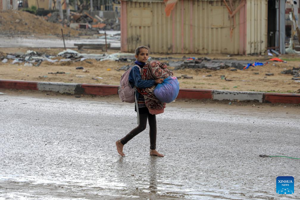 A girl leaves home after receiving evacuation orders from Israel in the southern Gaza Strip city of Khan Younis, on Jan. 29, 2024. The Hamas-run Health Ministry in Gaza said on Monday that the Palestinian death toll from the Israeli offensive on the enclave has reached 26,637 since it began on Oct. 7, 2023. (Photo by Rizek Abdeljawad/Xinhua)