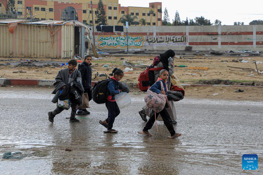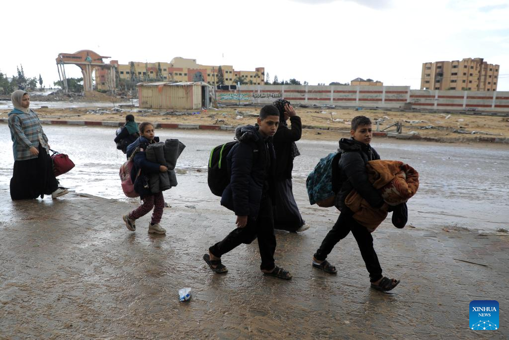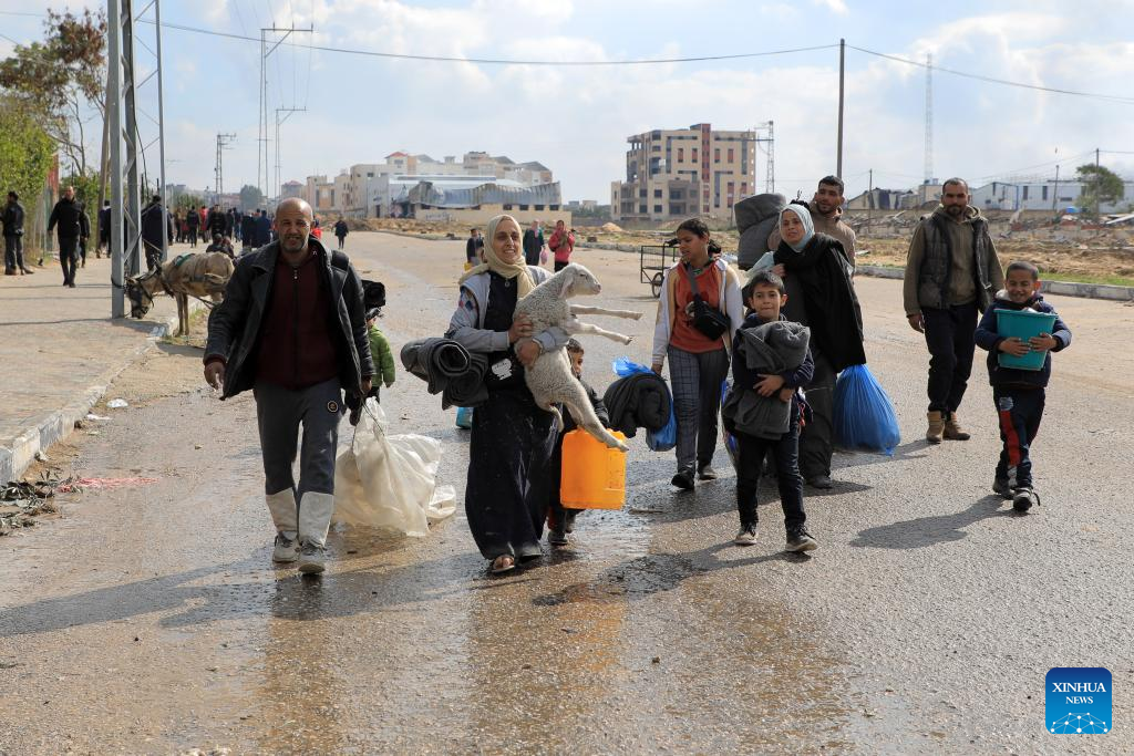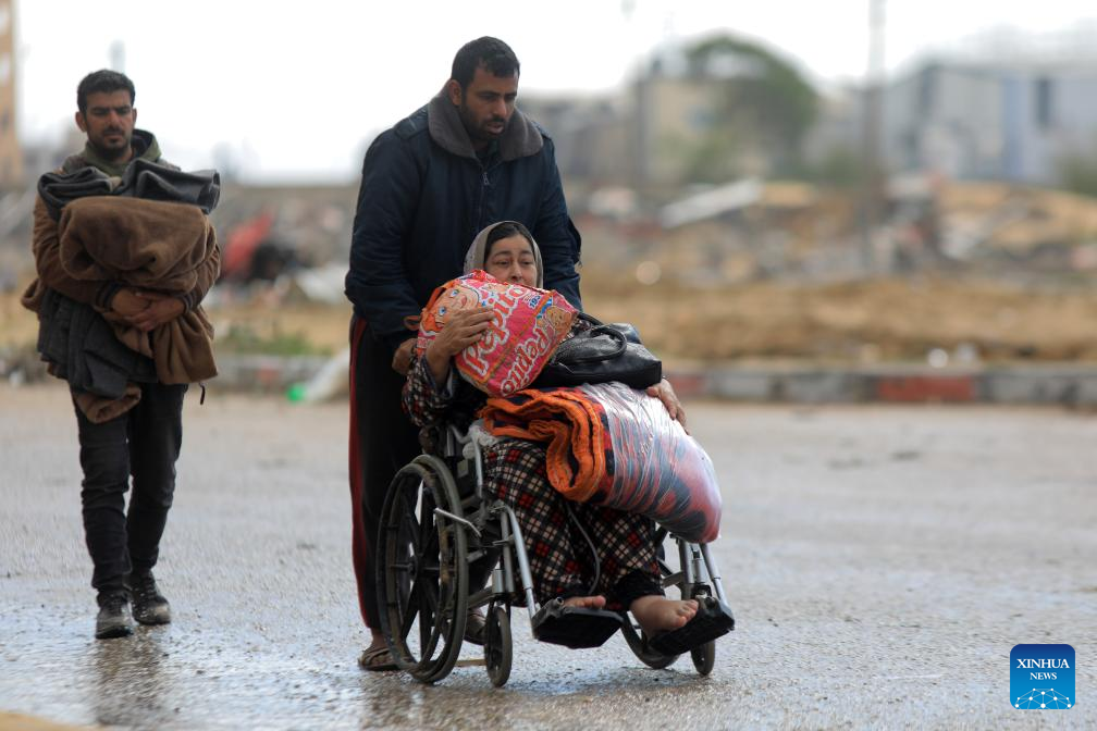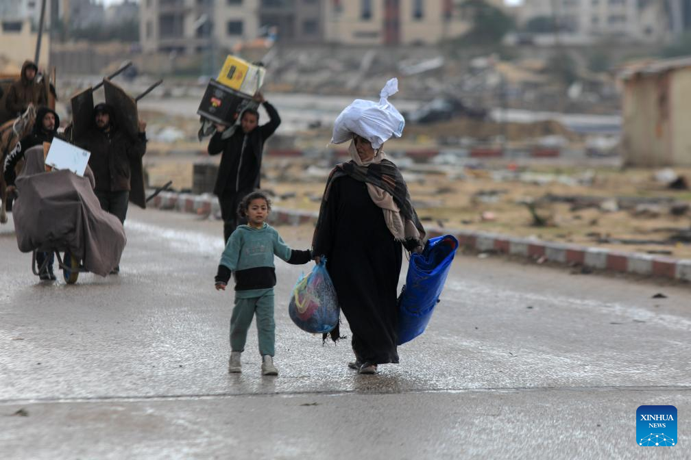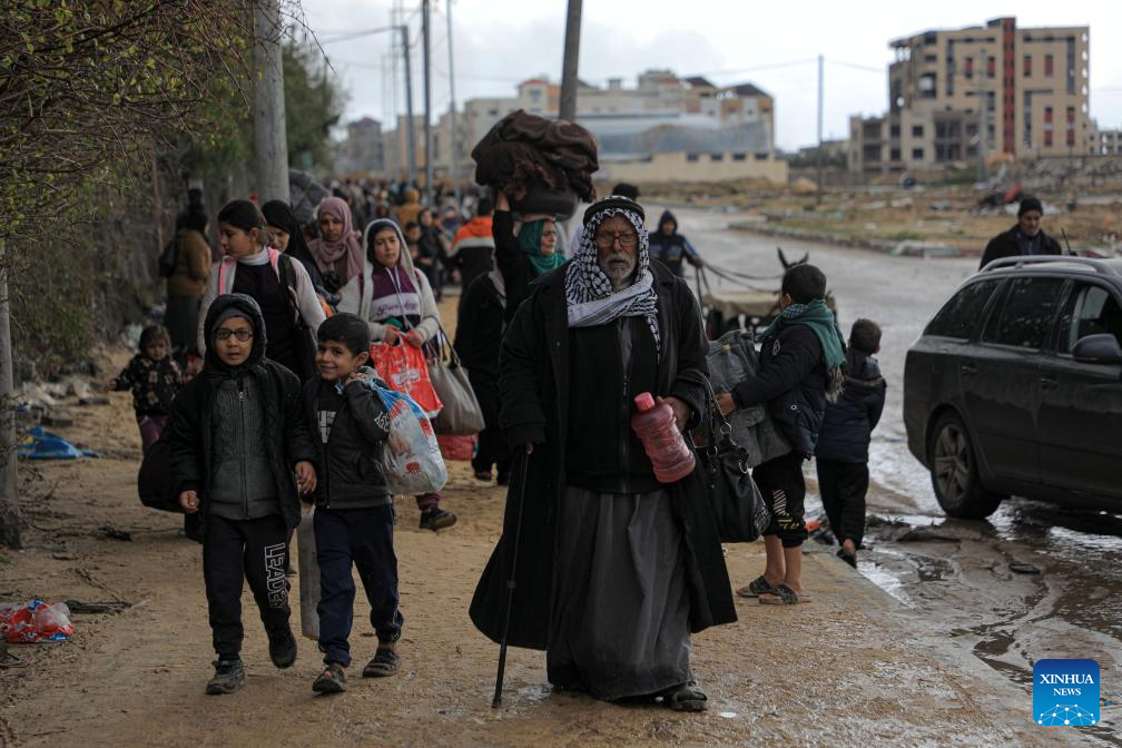 People leave their home after receiving evacuation orders from Israel in the southern Gaza Strip city of Khan Younis, on Jan. 29, 2024. The Hamas-run Health Ministry in Gaza said on Monday that the Palestinian death toll from the Israeli offensive on the enclave has reached 26,637 since it began on Oct. 7, 2023. (Photo by Rizek Abdeljawad/Xinhua)