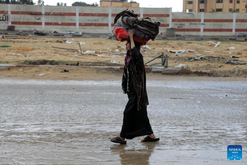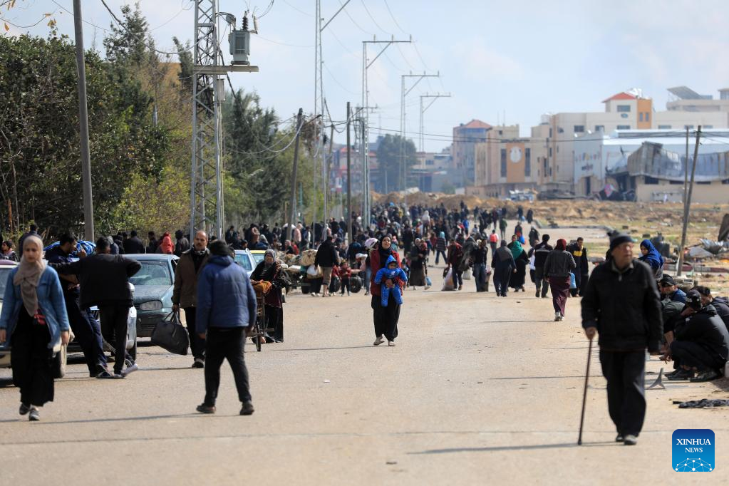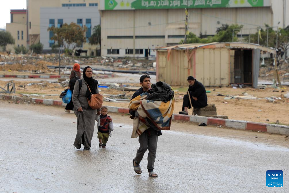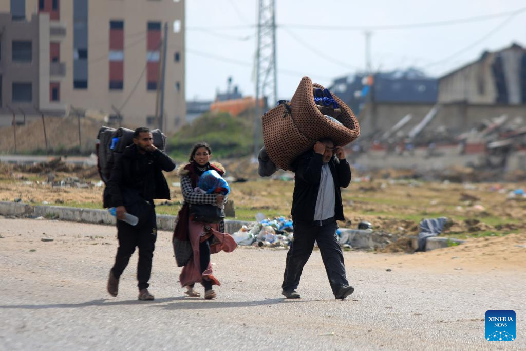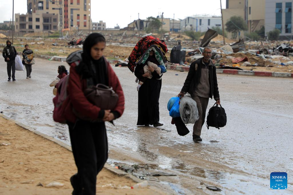 People leave their home after receiving evacuation orders from Israel in the southern Gaza Strip city of Khan Younis, on Jan. 29, 2024. The Hamas-run Health Ministry in Gaza said on Monday that the Palestinian death toll from the Israeli offensive on the enclave has reached 26,637 since it began on Oct. 7, 2023. (Photo by Rizek Abdeljawad/Xinhua)