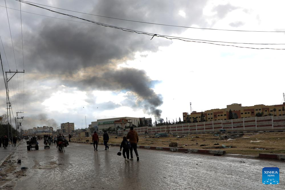Smoke rises after an Israeli strike in the southern Gaza Strip city of Khan Younis, on Jan. 29, 2024. The Hamas-run Health Ministry in Gaza said on Monday that the Palestinian death toll from the Israeli offensive on the enclave has reached 26,637 since it began on Oct. 7, 2023. (Photo by Rizek Abdeljawad/Xinhua)