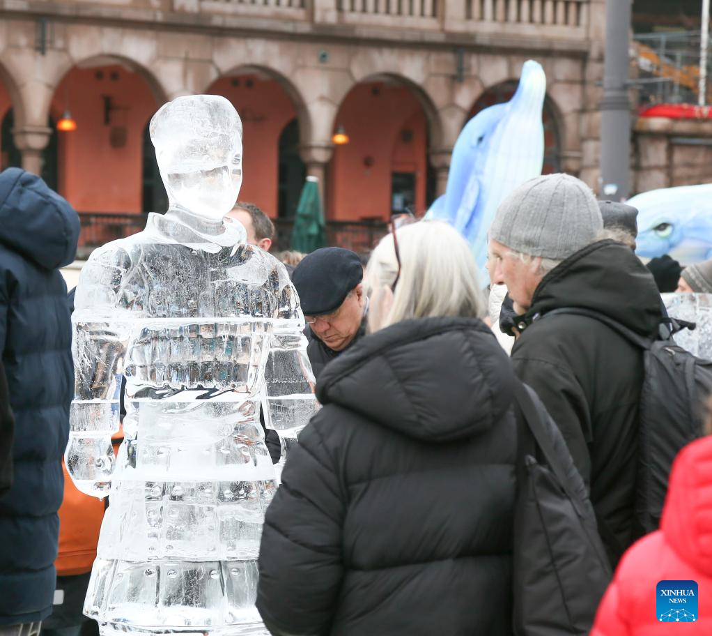 Visitors watch ice sculptures and lanterns in Oslo, capital of Norway, Jan. 28, 2024. (Photo by Chen Yaqin/Xinhua)