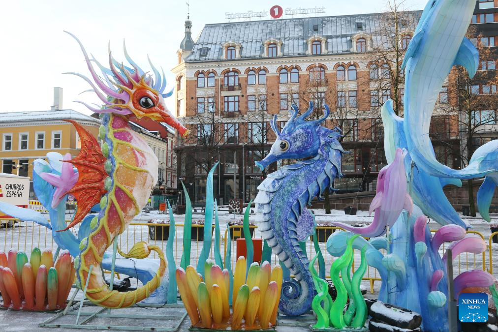 This photo taken on Jan. 27, 2024 shows some festive lanterns displayed in Oslo, capital of Norway. (Photo by Chen Yaqin/Xinhua)