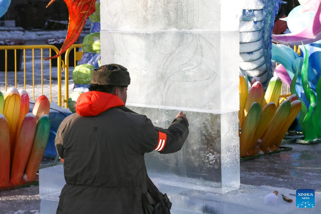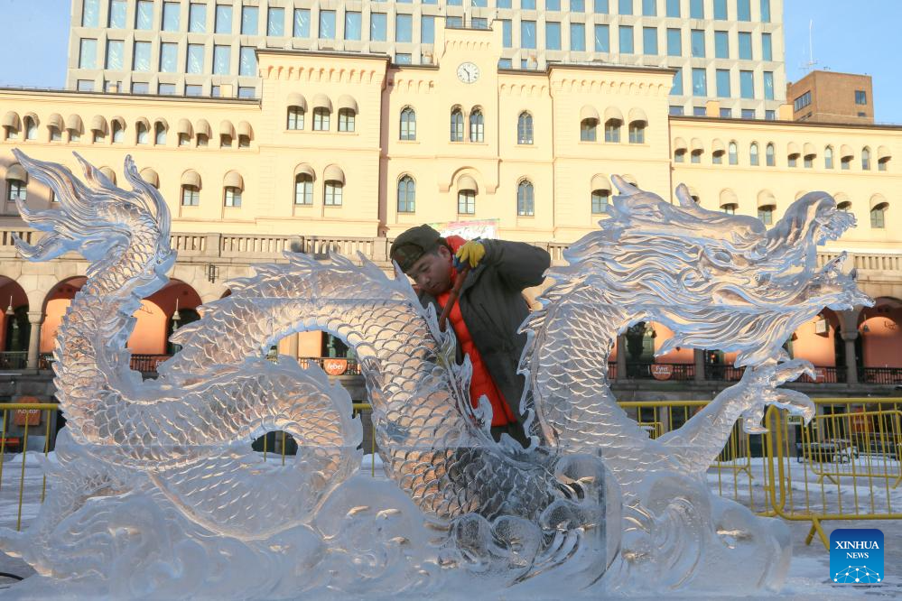 A craftsman makes an ice sculpture in Oslo, capital of Norway, Jan. 27, 2024. (Photo by Chen Yaqin/Xinhua)
