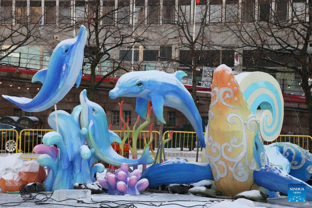 This photo taken on Jan. 28, 2024 shows some ice sculptures and lanterns displayed in Oslo, capital of Norway. (Photo by Chen Yaqin/Xinhua)