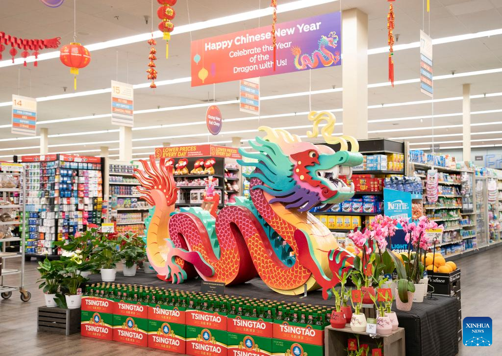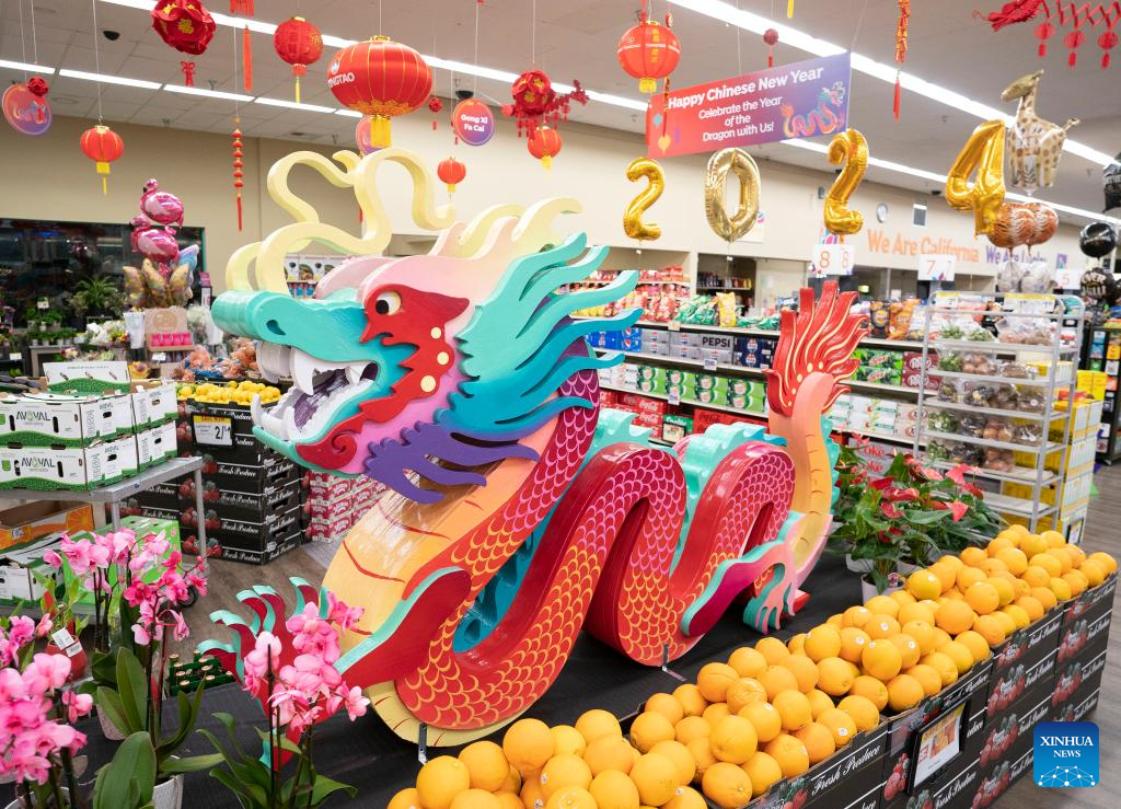 This photo taken on Jan. 28, 2024 shows a dragon-shaped installation in preparation for the upcoming Chinese Lunar New Year at a supermarket in San Francisco, the United States. (Photo by Li Jianguo/Xinhua)