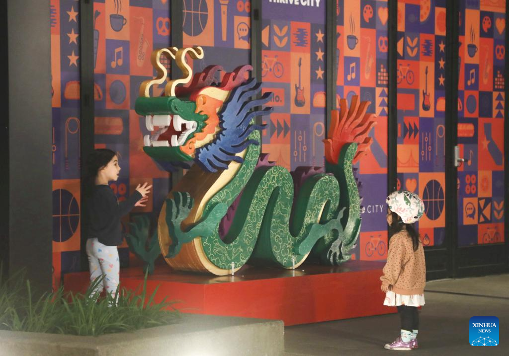 Children watch a dragon-shaped installation in preparation for the upcoming Chinese Lunar New Year in San Francisco, the United States, Jan. 28, 2024. (Photo by Liu Yilin/Xinhua)