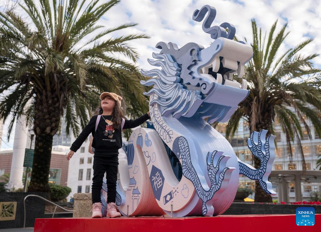 A child poses with a dragon-shaped installation in preparation for the upcoming Chinese Lunar New Year at the Union Square in San Francisco, the United States, Jan. 28, 2024. (Photo by Li Jianguo/Xinhua)