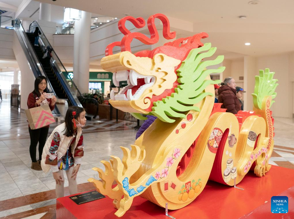 People watch a dragon-shaped installation in preparation for the upcoming Chinese Lunar New Year at a shopping mall in San Francisco, the United States, Jan. 28, 2024. (Photo by Li Jianguo/Xinhua)